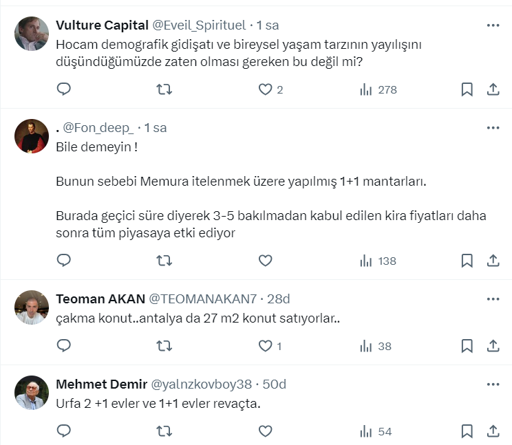 Ahmet Büyükduman, yaptığı paylaşımında "Konutta da şirinkflasyon" diyerek, "Yapı ruhsatı alınan konutların ortalama büyüklüğü azalmaya devam ediyor. Urfa’da bile ortalama büyüklük 76 metrekareye düşmüş görünüyor" ifadelerini kullandı.