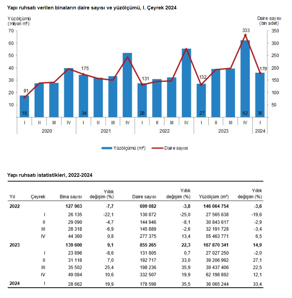 Türkiye İstatistik Kurumu tarafından açıklanan verilere bir önceki senenin aynı çeyreğine göre, 2024 yılının 1. çeyreğinde belediyeler tarafından yapı ruhsatı verilen bina sayısı yüzde 19,9, daire sayısı yüzde 35,5 ve yüzölçüm yüzde 33,4 arttı.