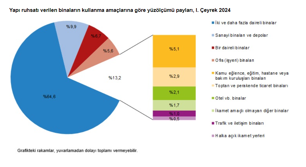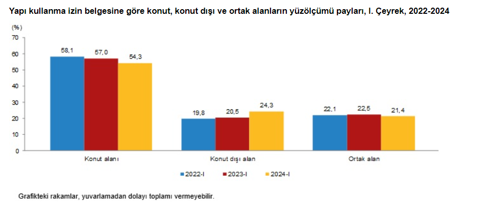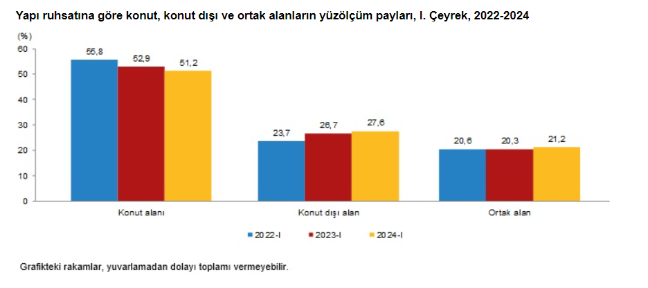 Açıklanan rakamlara göre toplam yüzölçümün yüzde 51,2'si konut alanı olarak gerçekleşti. Belediyeler tarafından 2024 yılı 1. çeyreğinde yapı ruhsatı verilen binaların toplam yüzölçümü 36,1 milyon metrekare iken; bunun 18,5 milyon metrekaresi konut, 10,0 milyon metrekaresi konut dışı ve 7,6 milyon metrekaresi de ortak kullanım alanı olarak gerçekleşti.
