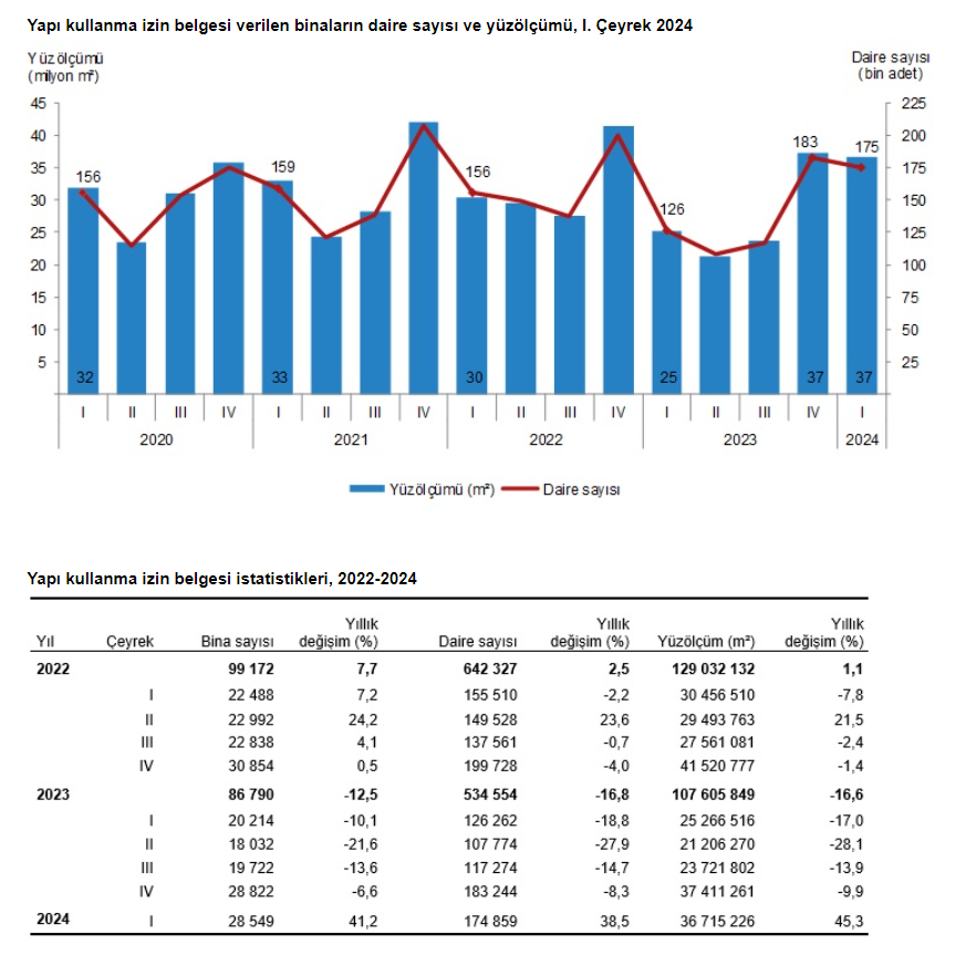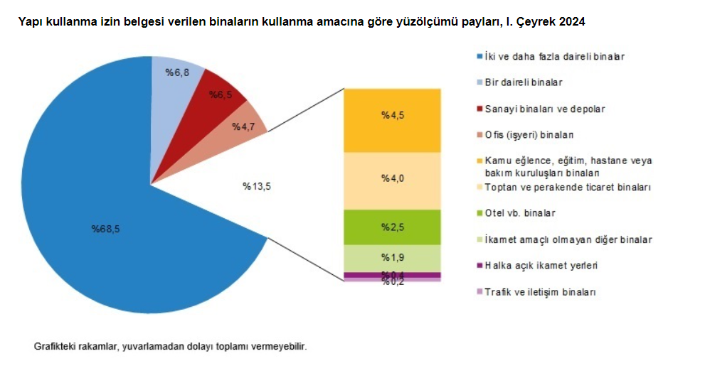 Yine TÜİK tarafından açıklanan rakamlara göre belediyeler tarafından 2024 yılının 1. çeyreğinde yapı kullanma izin belgesi verilmiş olan binaların toplam yüzölçümü 36,7 milyon metrekare şeklinde iken; bunun 19,9 milyon metrekaresi konut, 8,9 milyon metrekaresi konut dışı ve 7,9 milyon metrekaresi de ortak kullanım alanı şeklinde gerçekleşti.