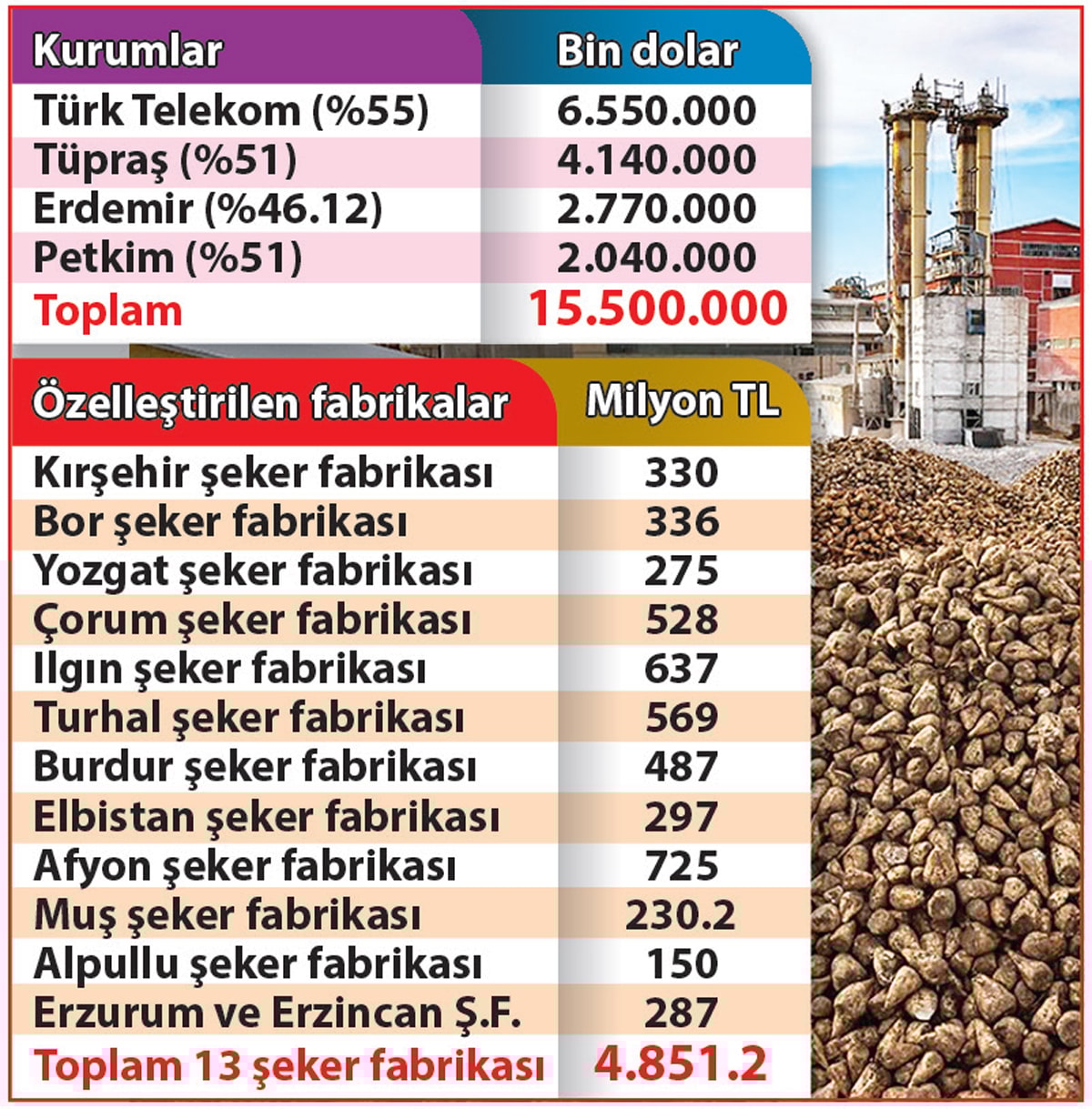 Konu ile ilgili olarak paylaşılan detaylara göre şehir ve bölgelerin ekonomisini ayakta tutan et, süt, şeker, tütün ve tekstil fabrikaları başta olacak şekilde pek çok fabrikanın satışa çıkarılması bu il ve bölgelerde işsizlik ve beraberinde göçlere neden oldu. Konu ile ilgili olarak bir örnek vermek gerekirse, büyük itirazlara rağmen yok pahasına satılan 13 şeker fabrikasından devletin kasasına sadece o dönemin parasıyla 4 milyar 851 milyon Türk Lirası girdi. Söz konusu bu tutar 693 milyar TL’lik özelleştirme masrafının yanında adeta devede kulak kaldı.