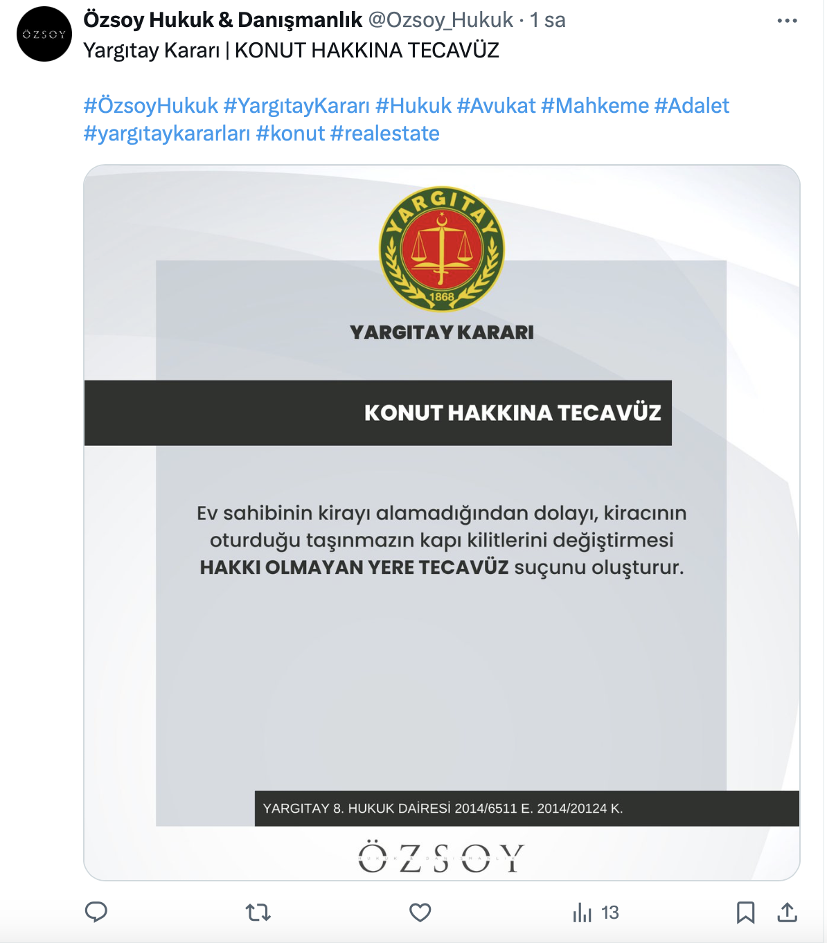 Özsoy Hukuk - Danışmanlık sosyal medya hesabı https://x.com/Ozsoy_Hukuk üzerinden Yargıtay kararını paylaşarak, ev sahibinin kirayı alamadığından dolayı, kiracının oturduğu taşınmazın kapı kilitlerini değiştirmesinin hakkı olmayan yere tecavüz suçunu oluşturduğunu belirtti.
