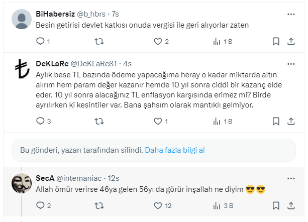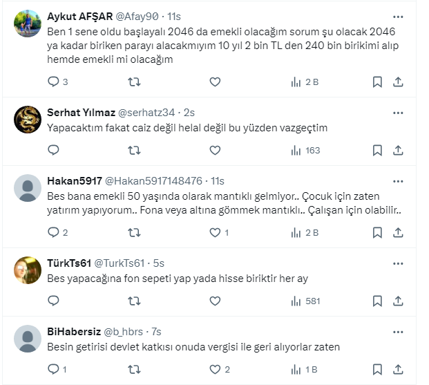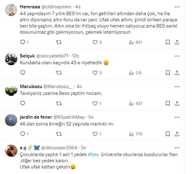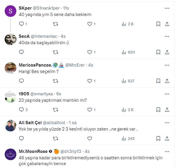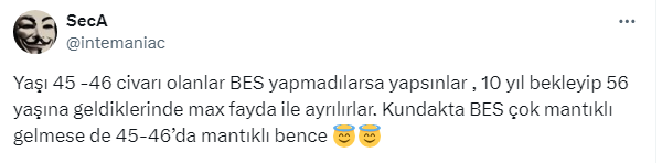 SecA adlı kullanıcı https://twitter.com/intemaniac X sosyal medya hesabından yaptığı paylaşımda, “Yaşı 45 -46 civarı olanlar BES yapmadılarsa yapsınlar , 10 yıl bekleyip 56 yaşına geldiklerinde maximum fayda ile ayrılırlar. Kundakta BES çok mantıklı gelmese de 45-46’da mantıklı bence” dedi.