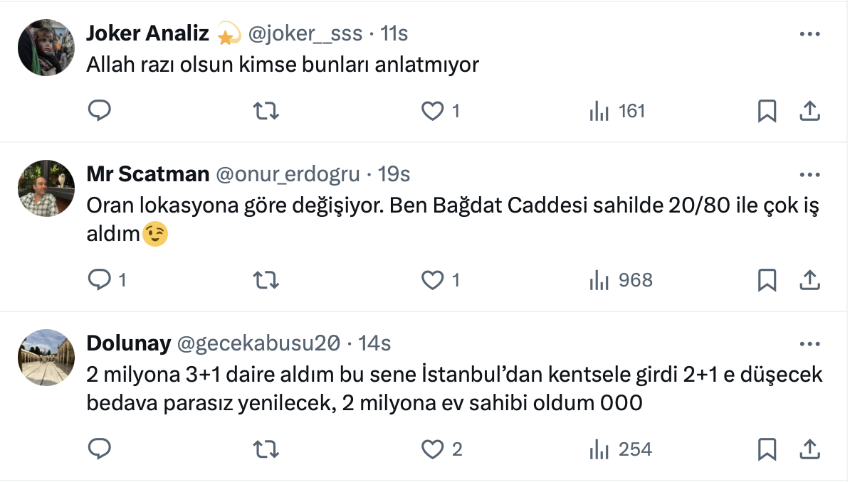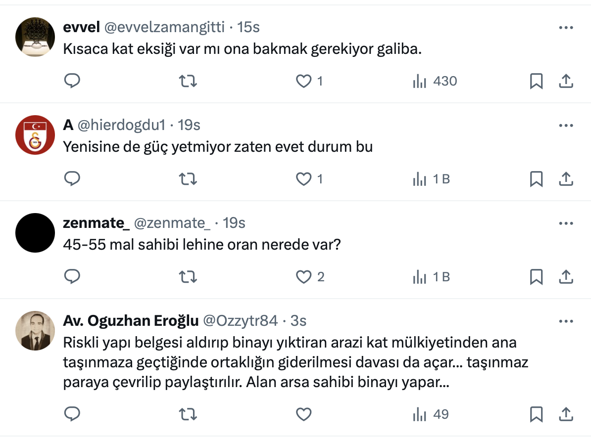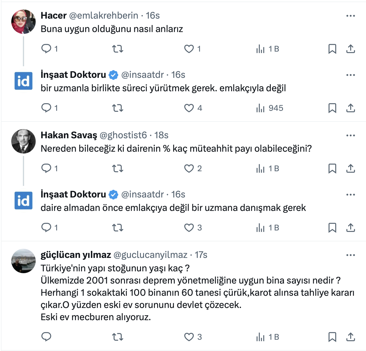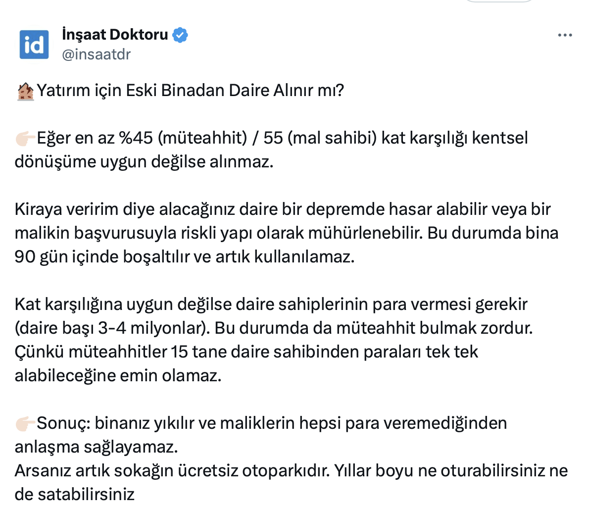 57,1 bin takipçili İnşaat Doktoru “Yatırım için eski binadan daire alınır mı?” sorusuna yanıt vererek, "Eğer en az %45 (müteahhit) / 55 (mal sahibi) kat karşılığı kentsel dönüşüme uygun değilse alınmaz." ifadelerini kullandı.