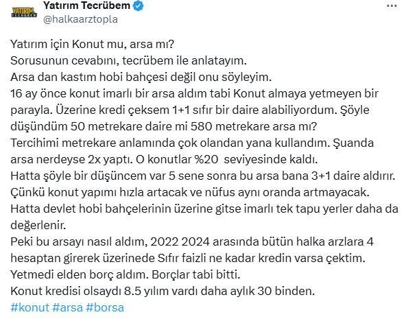 Yatırım Tecrübem isimli sosyal medya X kullanıcısı, vatandaşlara yatırımda 'konut mu, arsa mı?' sorusunun yanıtını tecrübesiyle anlattı.