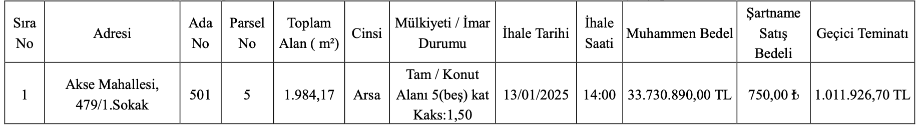 Kocaeli Çayırova’da yer alan arsanın arsa alanı bin 984,17 metrekare olarak açıklandı. Konut alanı imarlı arsanın muhammen bedeli 33 milyon 739 bin 890 TL olarak belirtilirken, geçici teminat bedeli ise 1 milyon 11 bin 926,70 TL olarak açıklandı.