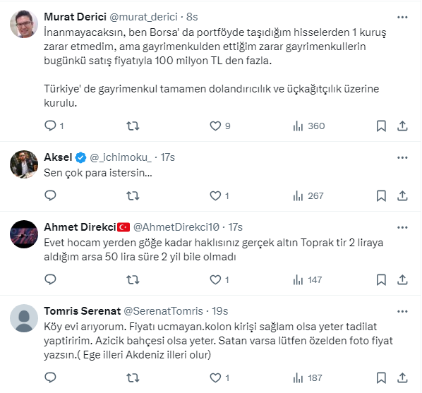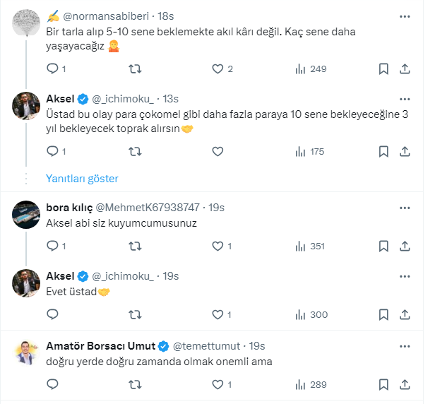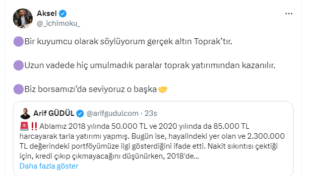 Dolar mı, faiz mi, altın mı derken, sosyal medyada Aksel kullanıcı adıyla yatırım tavsiyelerini paylaşan kuyumculuk yapan yatırımcı, altın yerine toprak alımının tavsiye etti. Aksel, pttps://twitter.com/_ichimoku_ X sosyal medya hesabından yaptığı paylaşımda, toprak yatırımcısı Arif Güdül’ün verdiği yatırım örneğini de paylaştı. Yaptığı paylaşımda şunları söyledi: