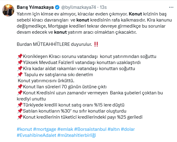 Ekonomist Barış Yılmazkaya da sosyal medya hesabından yatırım için artık kimsenin ev almadığını söyledi. Konut krizininin baş sebebinin kiracı davranışları ve konut kredisinin rafa kalkması olduğubu söyleyen Yılmazkaya, 'konut yatırım aracı olmaktan çıkacak' yorumunu yaptı.