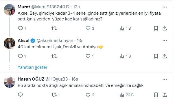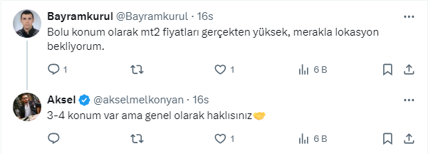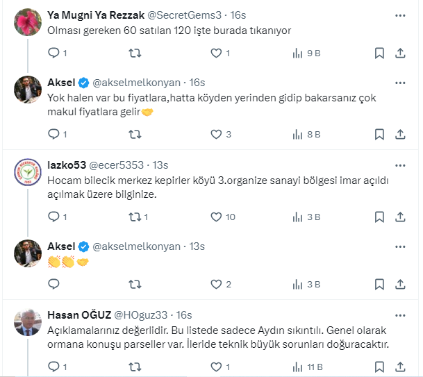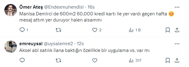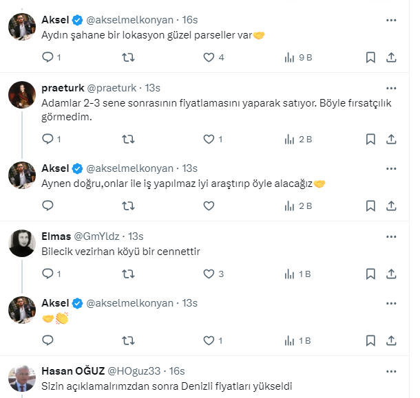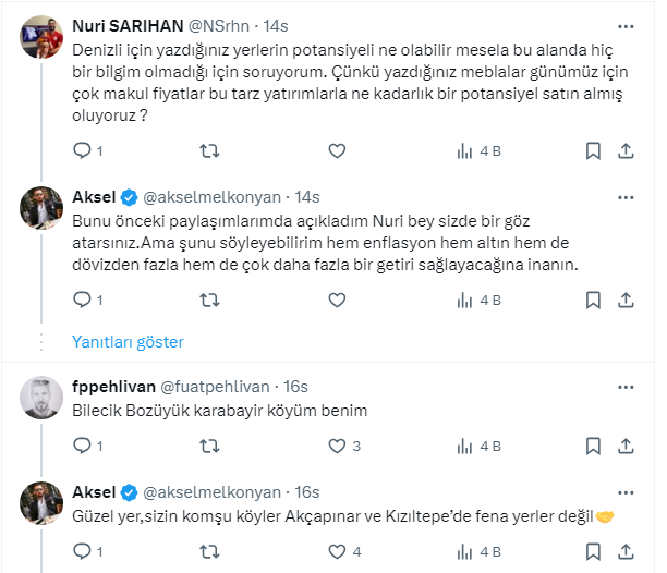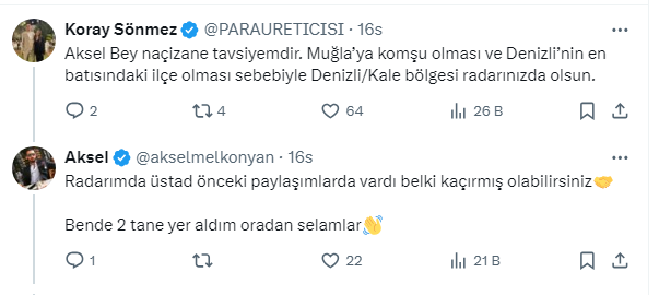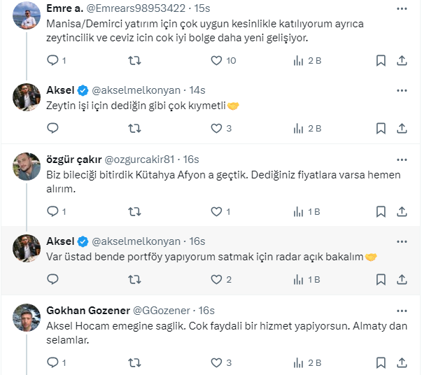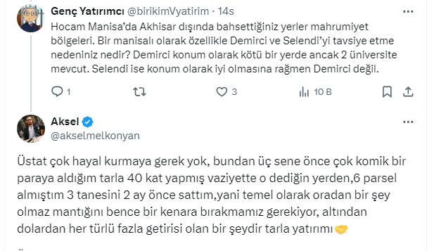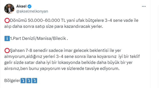 Arazi ve toprak birçok yatırımcının radarında.Toprak yatırımcısı ve danışmanı 43,4 bin takipçili Aksel Melkonyan, https://x.com/akselmelkonyan X sosyal medya hesabından yaptığı paylaşımda dönümü 50.000-60.000 TL yani ufak bütçelere 3-4 sene vade ile alıp daha sonra satıp para kazandıracak yerleri sıradı.