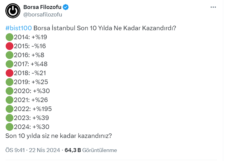 241,3 bin takipçili Borsa Filozofu resmi X hesabı https://twitter.com/borsafilozofu üzerinden Borsa İstanbul'un son 10 yılda ne kadar kazandırdığını paylaştı.