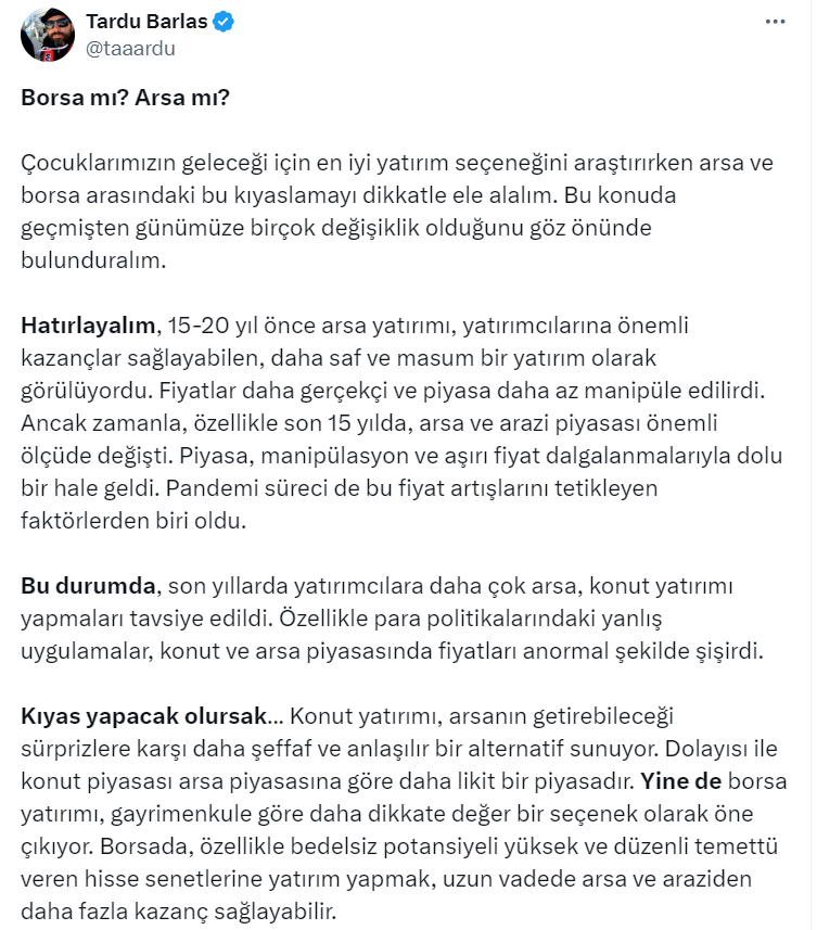 Borsa Temel Analisti Tardu Barlas resmi sosyal medya hesabı https://twitter.com/taaardu üzerinden "Borsa mı? Arsa mı?" paylaşımı yaptı. İşte Tardu Barlas'ın o paylaşımı ve paylaşıma gelen yorumlar...