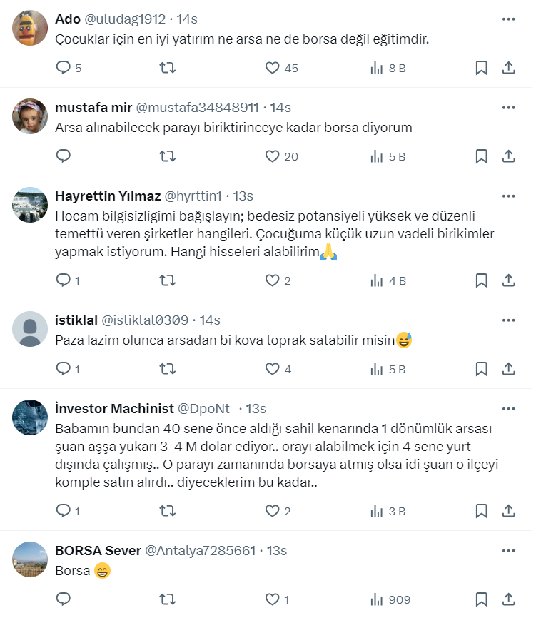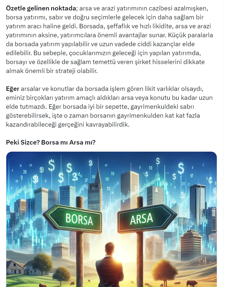 Özetle gelinen noktada; arsa ve arazi yatırımının cazibesi azalmışken, borsa yatırımı, sabır ve doğru seçimlerle gelecek için daha sağlam bir yatırım aracı haline geldi. Borsada, şeffaflık ve hızlı likidite, arsa ve arazi yatırımının aksine, yatırımcılara önemli avantajlar sunar. Küçük paralarla da borsada yatırım yapılabilir ve uzun vadede ciddi kazançlar elde edilebilir. Bu sebeple, çocuklarımızın geleceği için yapılan yatırımda, borsayı ve özellikle de sağlam temettü veren şirket hisselerini dikkate almak önemli bir strateji olabilir.