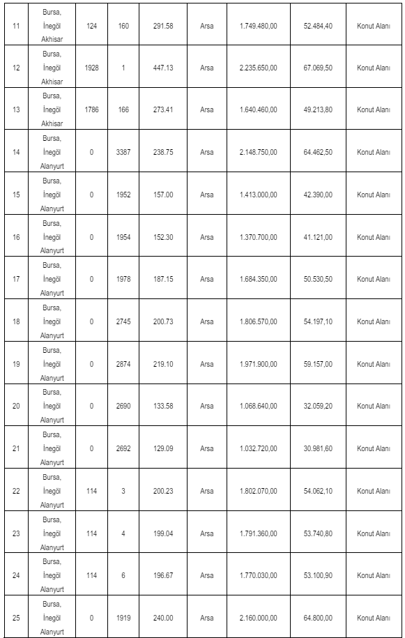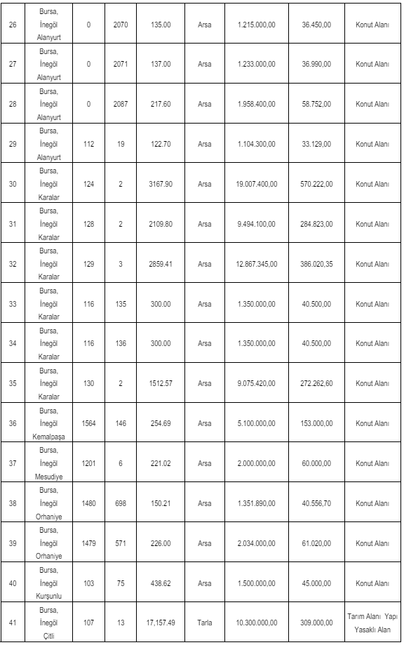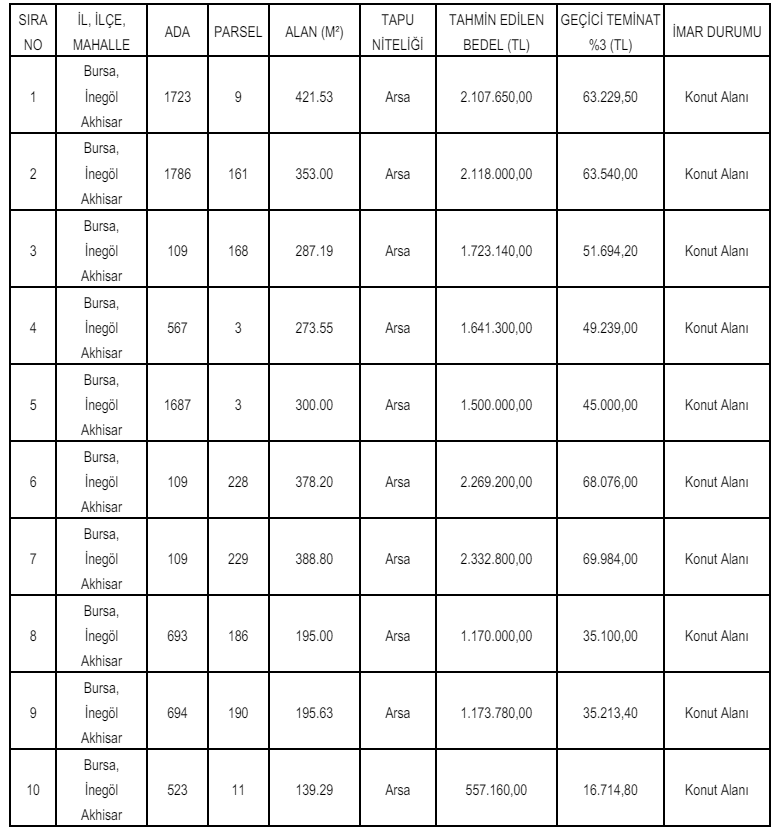 Gaziantep ve Bursa'da yer alan 44 adet arsa ile arazi satışa çıkarıldı. Bursa'da yer alan arsa ve arazilerin satış bedelleri 557 bin 160 TL ile 19 milyon 7 bin 400 TL arasında değişirken, geçici teminat bedelleri de 156 bin 714 TL ile 570 bin 222 TL arasında değişiyor.