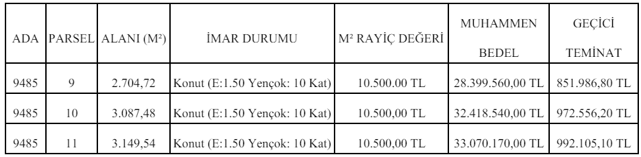 alanı, imar durumu, m² rayiç bedeli, muhammen bedeli ve geçici teminat tutarı belirtilen
