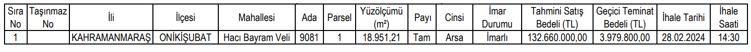 SATIŞ İHALESİ YAPILACAK TAŞINMAZ