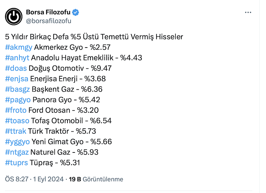 Borsa İstanbul'da temettü verecek şirketler pek çok kişi tarafından araştırılırken, 251,8 bin takipçili Borsa Filozofu da resmi sosyal medya hesabı üzerinden 5 yıldır birkaç defa yüzde 5 üstü temettü vermiş hisseleri açıkladı.