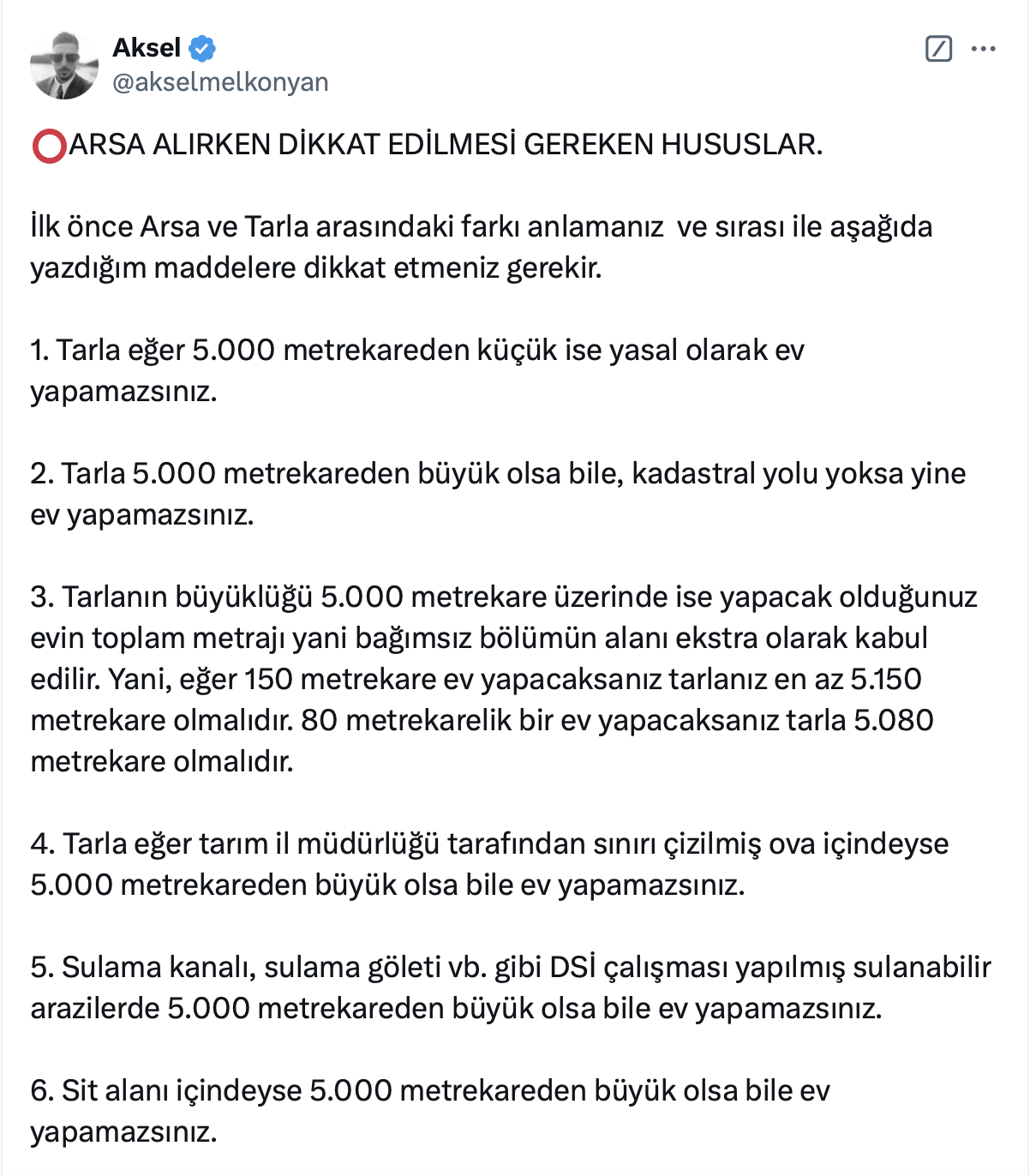 Aksel Melkonyan yaptığı paylaşımda arsa alırken dikkat edilmesi gerekenleri açıkladı.