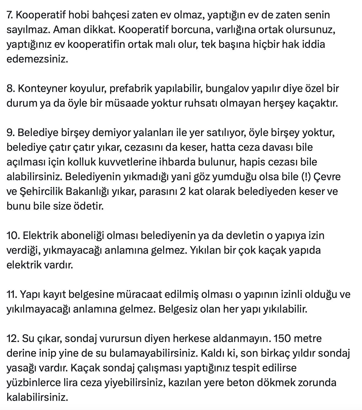 9. Belediye birşey demiyor yalanları ile yer satılıyor, öyle birşey yoktur, belediye çatır çatır yıkar, cezasını da keser, hatta ceza davası bile açılması için kolluk kuvvetlerine ihbarda bulunur, hapis cezası bile alabilirsiniz. Belediyenin yıkmadığı yani göz yumduğu olsa bile (!) Çevre ve Şehircilik Bakanlığı yıkar, parasını 2 kat olarak belediyeden keser ve bunu bile size ödetir.