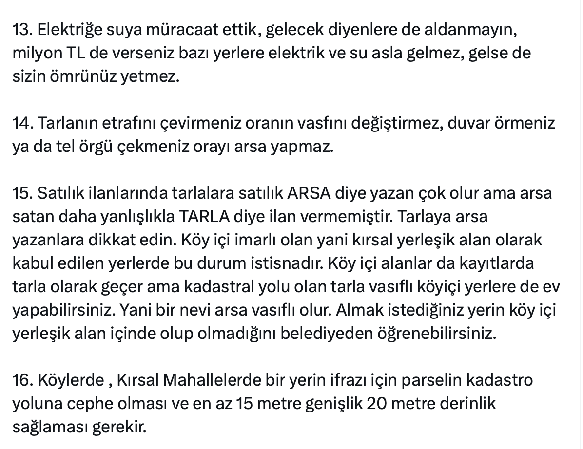 15. Satılık ilanlarında tarlalara satılık ARSA diye yazan çok olur ama arsa satan daha yanlışlıkla TARLA diye ilan vermemiştir. Tarlaya arsa yazanlara dikkat edin. Köy içi imarlı olan yani kırsal yerleşik alan olarak kabul edilen yerlerde bu durum istisnadır. Köy içi alanlar da kayıtlarda tarla olarak geçer ama kadastral yolu olan tarla vasıflı köyiçi yerlere de ev yapabilirsiniz. Yani bir nevi arsa vasıflı olur. Almak istediğiniz yerin köy içi yerleşik alan içinde olup olmadığını belediyeden öğrenebilirsiniz.