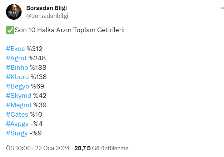 Borsa İstanbul güne yüzde 1,14 yükselişle başlarken yaptığı paylaşımlarla dikkat çeken Borsadan Bilgi de resmi sosyal medya hesabı üzerinden son 10 halka arzın toplam getirilerini açıkladı. İşte Borsadan Bilgi'nin o paylaşımı...