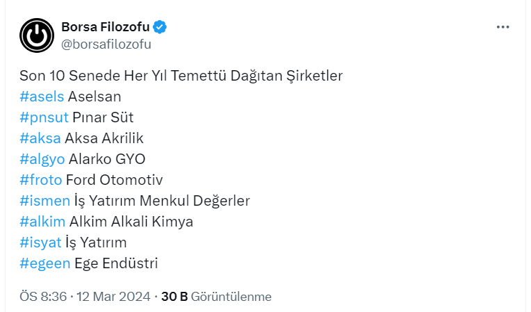 Borsa ile ilgili olarak yaptığı paylaşımlarla dikkat çeken 232,9 bin takipçili Borsa Filozofu resmi X hesabı https://twitter.com/borsafilozofu üzerinden son 10 senede her yıl temettü dağıtan şirketleri açıkladı.