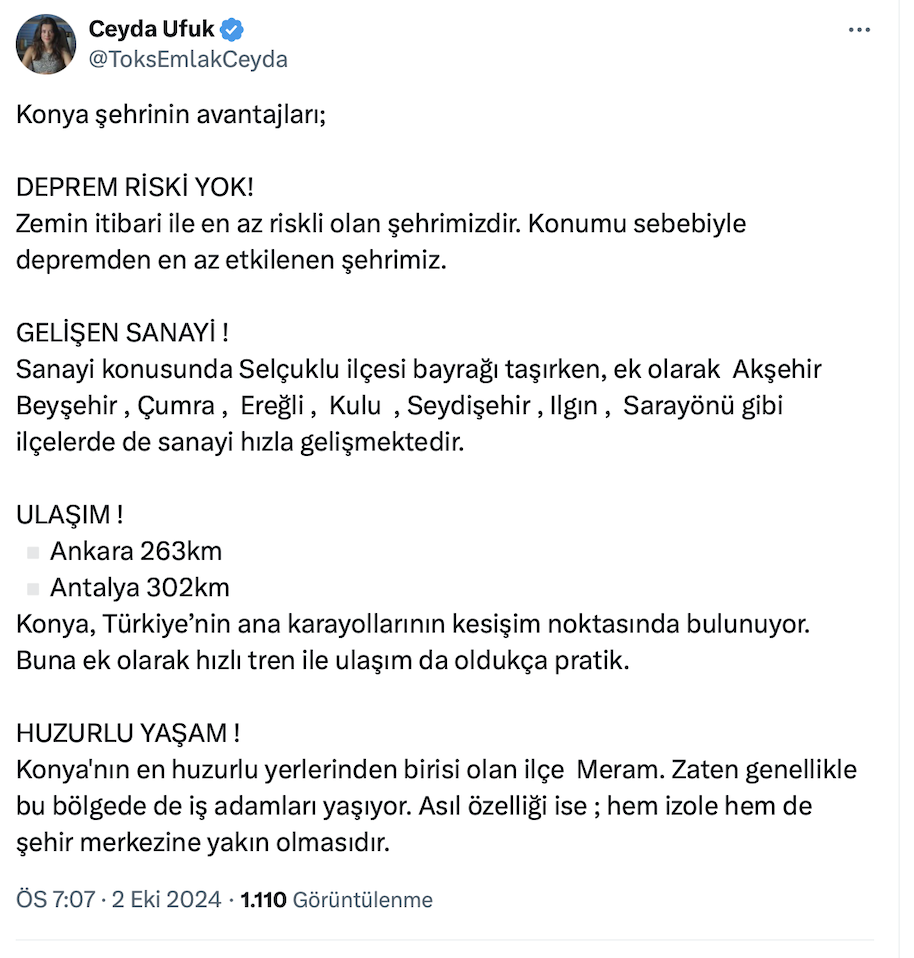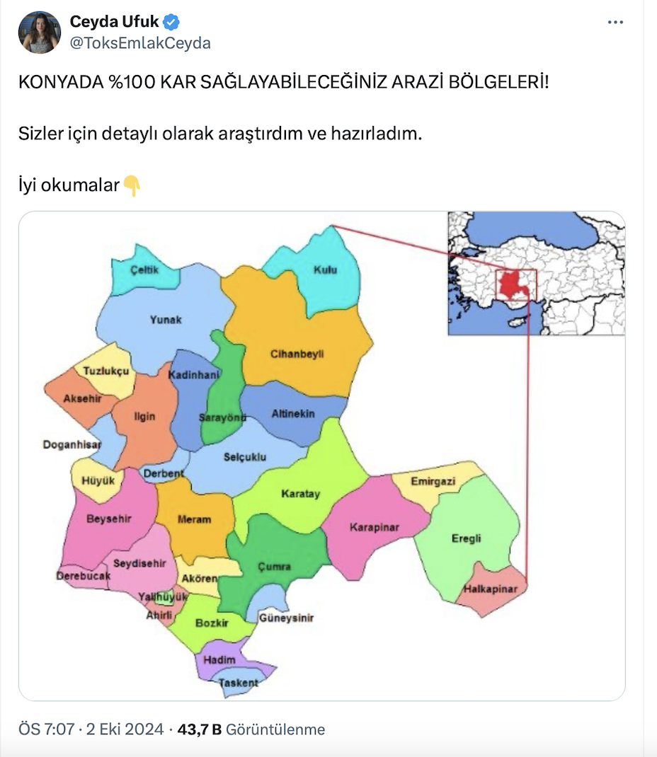 Gayrimenkul Değerleme Uzmanı Ceyda Ufuk resmi sosyal medya hesabı üzerinden yaptığı paylaşımda Konya’da yüzde 100 kar sağlayabileceğiniz arazi bölgelerini açıkladı.