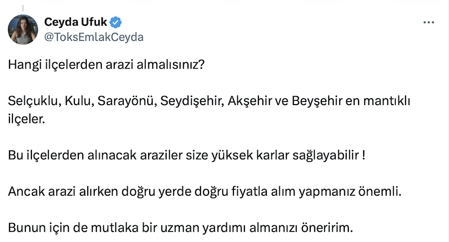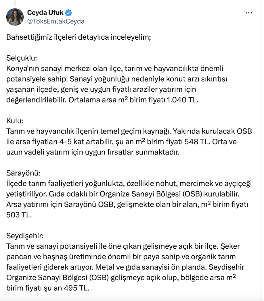 Yatırımların arsa ve arazilere kaydığı şu günlerde Gayrimenkul Değerleme Uzmanı Ceyda Ufuk resmi sosyal medya hesabı https://x.com/ToksEmlakCeyda üzerinden yaptığı paylaşımda Konya’da yüzde 100 kar sağlayabileceğiniz arazi bölgelerini açıkladı.