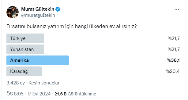 Gayrimenkul uzmanı Murat Gültekin sosyal medya hesabı X'ten yatırımcılar için '' Fırsatını bulsanız yatırım için hangi ülkeden ev alırsınız?''başlığı ile bir anket yaptı. Türkiye, Yunanistan, Amerika ve Karadağ'ın yer aldığı ankete 3 bin 428 kişi katıldı. Sonucunda ise yatırımcıların en çok Amerika'dan konut satın almak istediği ortaya çıktı. İşte Murat Gültekin'in sosyal medya hesabı X'ten yaptığı o paylaşım ve gelen yorumlar....
