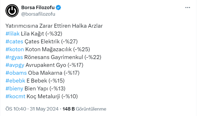 250,2 bin takipçili Borsa Filozofu resmi X hesabı https://x.com/borsafilozofu yaptığı paylaşımda yatırımcısına zarar ettiren halka arzları açıkladı.