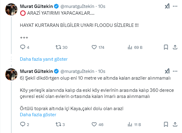 Gültekin, arazi yatırımı konusunda hayat kurtaran bilgileri tek tek açıkladı. Arsa ve arazi alırken, neye dikkat edilmesi gerektiğini maddeler halinde açıklayan Gültekin yatırımcıları sosyal medya hesabı X'ten uyardı. İşte o paylaşım...