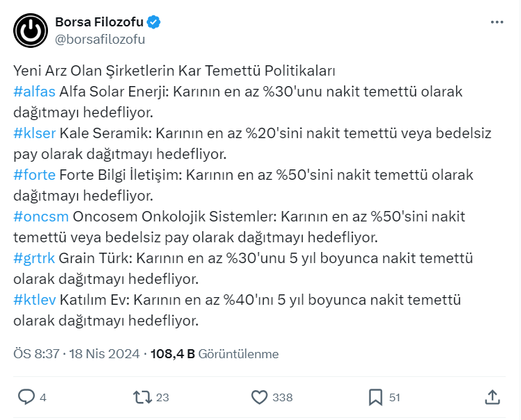 240,4 bin takipçili Borsa Filozofu resmi X hesabı https://twitter.com/borsafilozofu üzerinden yeni arz olan şirketlerin kar temettü politikalarını paylaştı.
