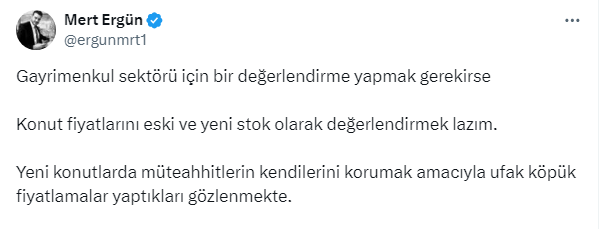 Konut fiyatlarını eski ve yeni stok olarak değerlendirmek gerektiğini söyleyen girişimci Mert Ergün https://twitter.com/ergunmrt1 gayrimenkul sektörü ile ilgili bir değerlendirme yaptı. Ergün yaptığı paylaşımda şunları söyledi: