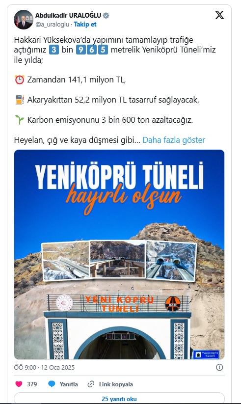 Ulaştırma ve Altyapı Bakanı Abdulkadir Uraloğlu, Hakkari-Yüksekova Yolu üzerindeki Yeniköprü Tüneli’nin trafiğe açıldığını ifade etti. Uraloğlu, 3 bin 965 metre uzunluğundaki tünelin devreye girmesiyle Yeniköprü ile Yüksekova arasındaki mesafenin 5 kilometre kısaldığını ve yolculuk süresinin 40 dakikadan 22 dakikaya indiğini söyledi.