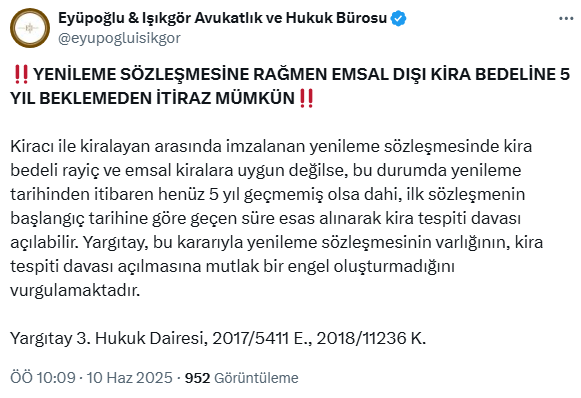 YENİLEME SÖZLEŞMESİNE RAĞMEN EMSAL DIŞI KİRA BEDELİNE 5 YIL BEKLEMEDEN İTİRAZ MÜMKÜN