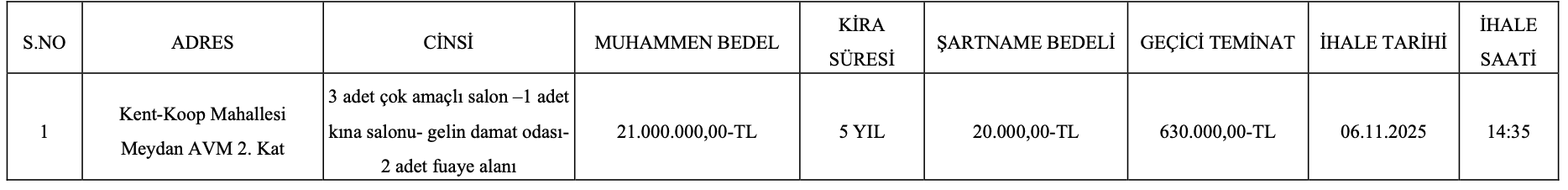1-Aşağıda kira süresi, muhammen bedeli, geçici teminatı, ihale tarihi ve saati belirtilen, Mülkiyeti Belediyemize ait, Kent Koop Mahallesi 61004 ada 2 parselde bulunan Batıkent Meydan AVM’ nin 2. Katında bulunan 3 adet çok amaçlı salon, 1 adet kına salonu, gelin-damat odası, 2 adet fuaye alanı, 2886 sayılı Devlet İhale Kanunun 36. maddesi gereğince “Kapalı teklif usulü” ile kiraya verilecektir.
