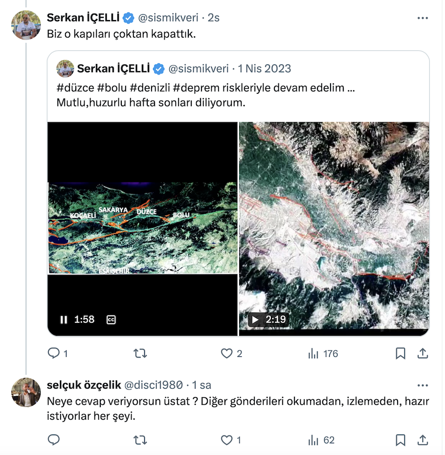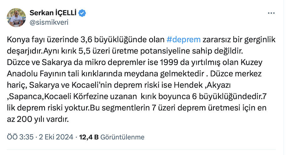 Son günlerde ülkemizin dört bir yanından sık sık irili ufaklı deprem haberleri gelirken, Maden Teknolojisi ve Yer Bilimleri Uzmanı Serkan İçelli, https://x.com/sismikveri resmi X sosyal medya hesabından çok konuşulacak bir paylaşım yaptı. Serkan İçelli yaptığı paylaşımda ‘7’lik deprem riski yok’ dediği iki şehri açıkladı.