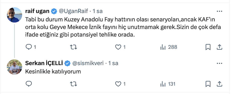 Konya fayı üzerinde 3,6 büyüklüğünde olan deprem zararsız bir gerginlik deşarjıdır. Aynı kırık 5,5 üzeri üretme potansiyeline sahip değildir. Düzce ve Sakarya’da mikro depremler ise 1999 da yırtılmış olan Kuzey Anadolu Fayının tali kırıklarında meydana gelmektedir. Düzce merkez hariç, Sakarya ve Kocaeli'nin deprem riski ise Hendek, Akyazı, Sapanca, Kocaeli Körfezine uzanan kırık boyunca 6 büyüklüğündedir. 7’lik deprem riski yoktur. Bu segmentlerin 7 üzeri deprem üretmesi için en az 200 yılı vardır.