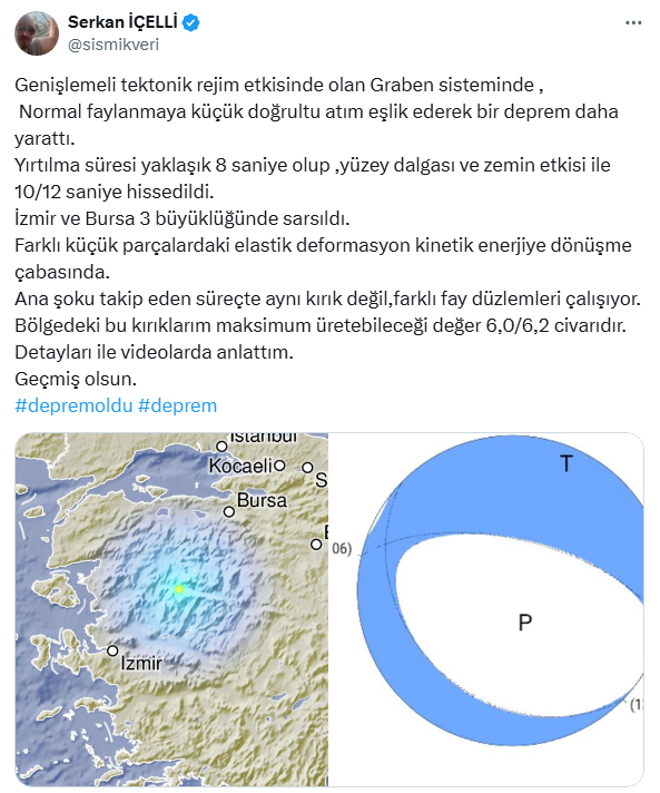 14 kilometre derinlikte meydana gelen depremle ilgili sosyal medya hesabından değerlendirmelerde bulunan Serkan İçelli, ''Normal faylanmaya küçük doğrultu atım eşlik ederek bir deprem daha yarattı.'' diyerek, bu bölgede maksimum oluşabilecek depremin 6.0-6.2 şiddetinde olacağını açıkladı.