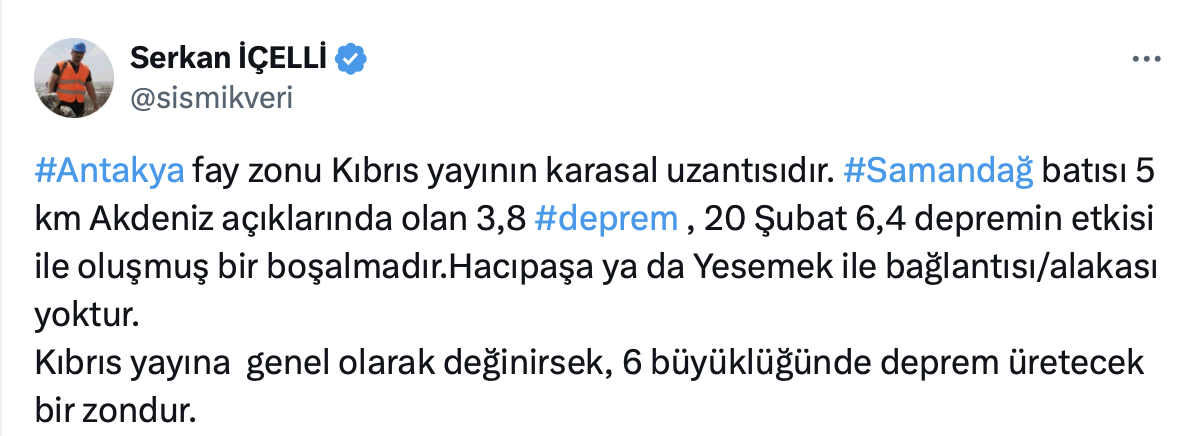 Maden Teknolojisi ve Yer Bilimleri Uzmanı Serkan İçelli Samandağ depremi ile ilgili olarak yaptığı paylaşımda Antakya fay zonu Kıbrıs yayının karasal uzantısı olduğunu söyleyerek, “6 büyüklüğünde deprem üretecek bir zondur.” dedi.