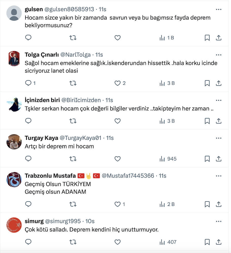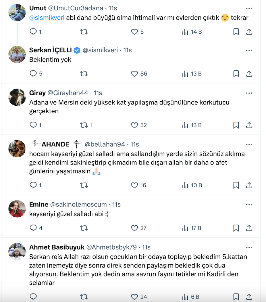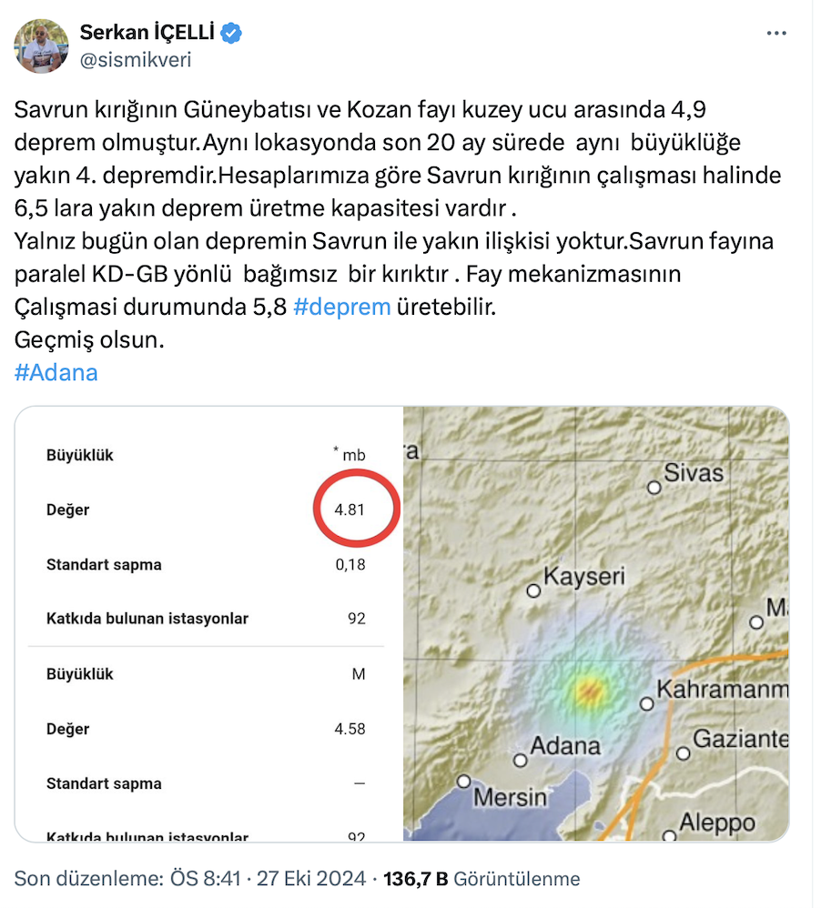 Maden Teknolojisi ve Yer Bilimleri Uzmanı Serkan İçelli, https://x.com/sismikveri resmi X sosyal medya hesabı üzerinden Adana depremi ile ilgili olarak yaptığı paylaşımda Savrun kırığının çalışması halinde 6,5’lara yakın deprem üretme kapasitesi olduğunu söyledi.