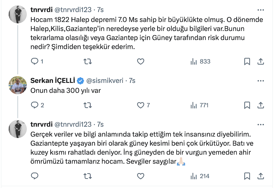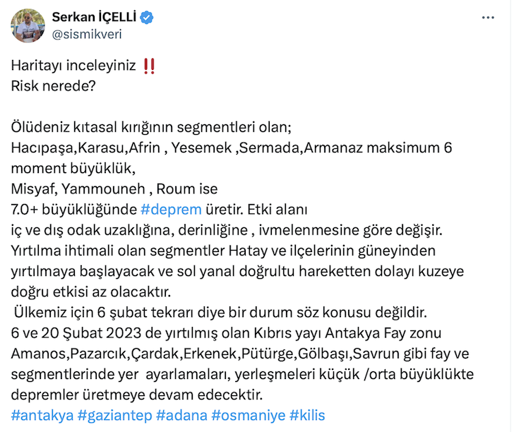 Maden Teknolojisi ve Yer Bilimleri Uzmanı Serkan İçelli yaptığı paylaşımda ülkemiz için 6 Şubat tekrarı diye bir durumun söz konusu olmadığını söyledi.