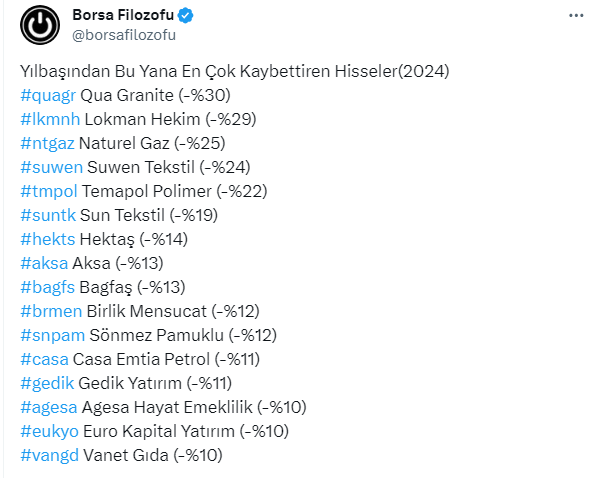 Yaptığı paylaşımlarla dikkat çeken Borsa Filozofu resmi sosyal medya hesabı https://twitter.com/borsafilozofu üzerinden yılbaşından bu yana en çok kaybettiren 14 hisseyi açıkladı.