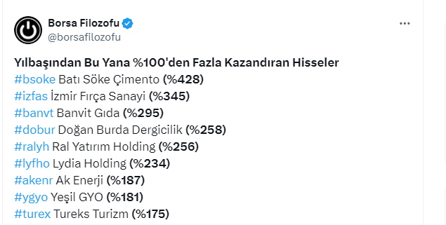 Endeks 10 bin puanın altına gerilerken 252 bin takipçili Borsa https://x.com/borsafilozofu X sosyal medya hesabından yaptığı paylaşımda, yılbaşından bu yana yüzde 100’den fazla kazandıran hisseleri ve kazanç oranlarını aktardı.