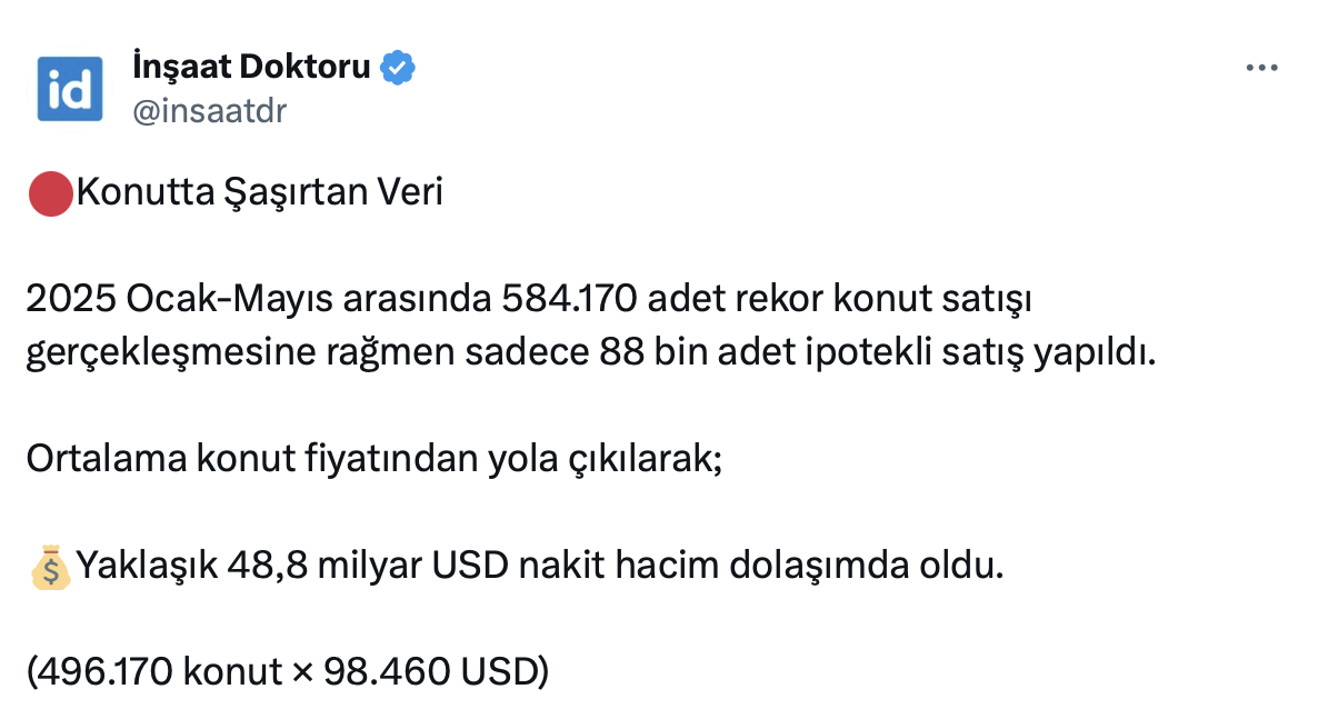 51,4 bin takipçili İnşaat Doktoru, resmi X hesabı üzerinden yaptığı paylaşımda yılın ilk 5 ayında satılan 584 bin 170 konutun sadece 88 bininin ipotekli olduğunu belirtti.