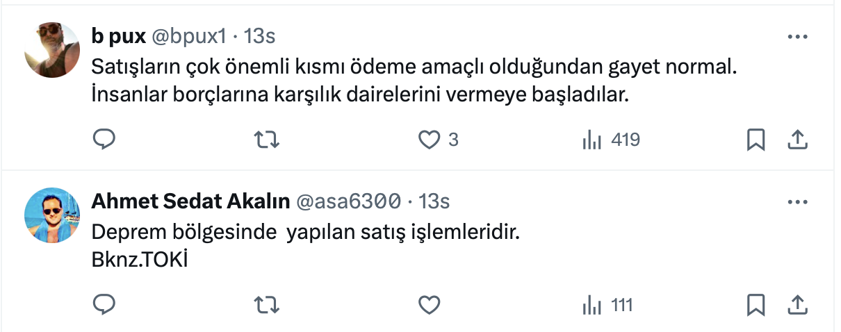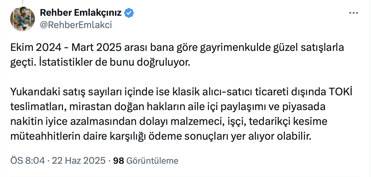İnşaat sektörü ile ilgili olarak yaptığı paylaşımlarla dikkat çeken 51,4 bin takipçili İnşaat Doktoru resmi X hesabı https://twitter.com/insaatdr üzerinden bu kez de konut satışları ile ilgili bir paylaşım yaptı.