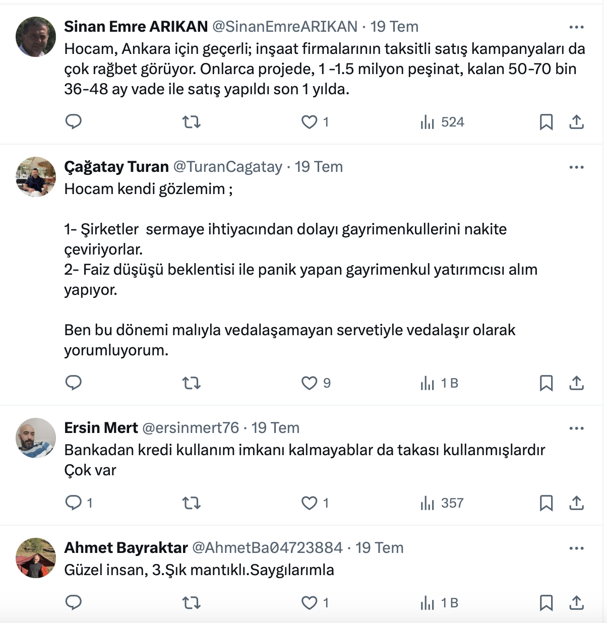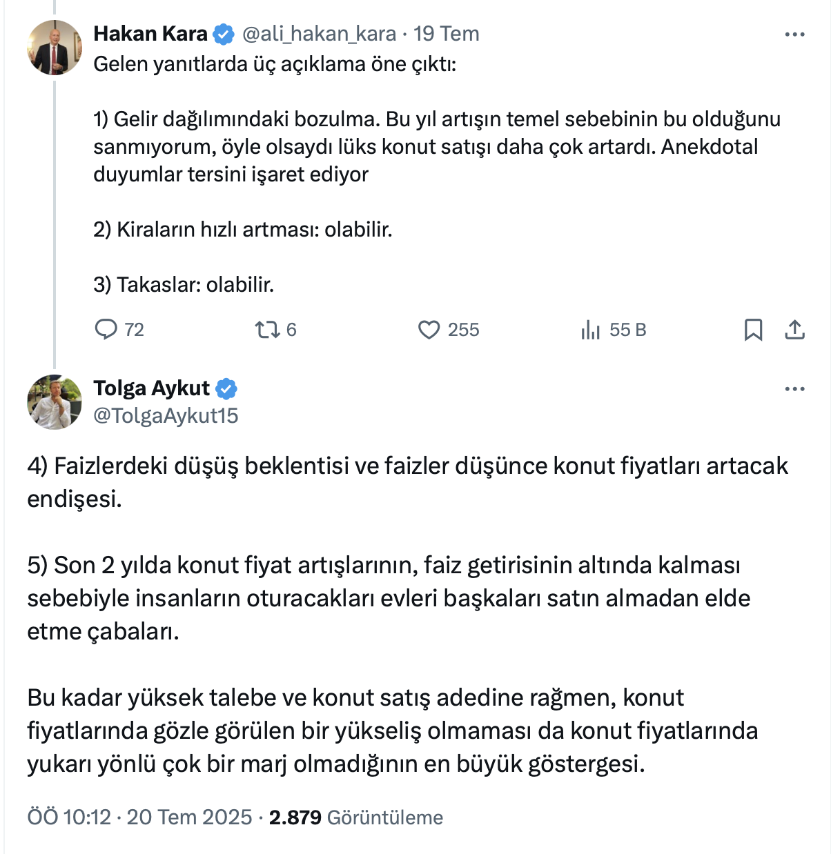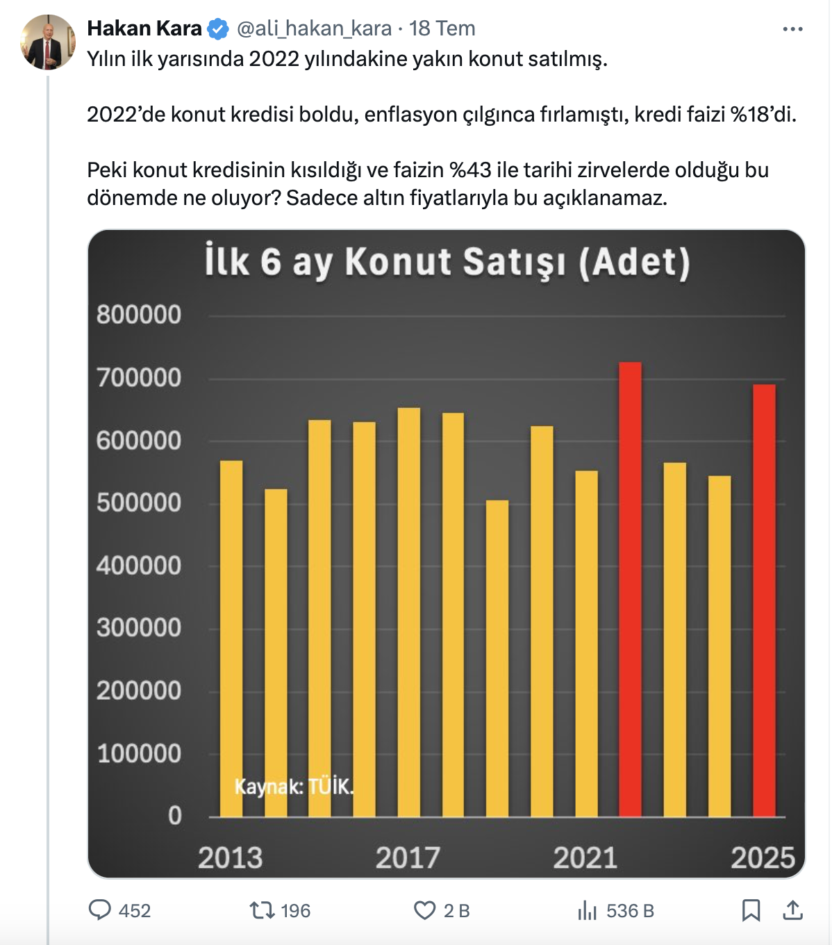 Prof. Dr. Ali Hakan Kara, resmi X hesabı https://twitter.com/ali_hakan_kara üzerinden yaptığı paylaşımda “Yılın ilk yarısında 2022 yılındakine yakın konut satılmış. 2022’de konut kredisi boldu, enflasyon çılgınca fırlamıştı, kredi faizi %18’di. Peki konut kredisinin kısıldığı ve faizin %43 ile tarihi zirvelerde olduğu bu dönemde ne oluyor? Sadece altın fiyatlarıyla bu açıklanamaz.” ifadelerini kullandı.