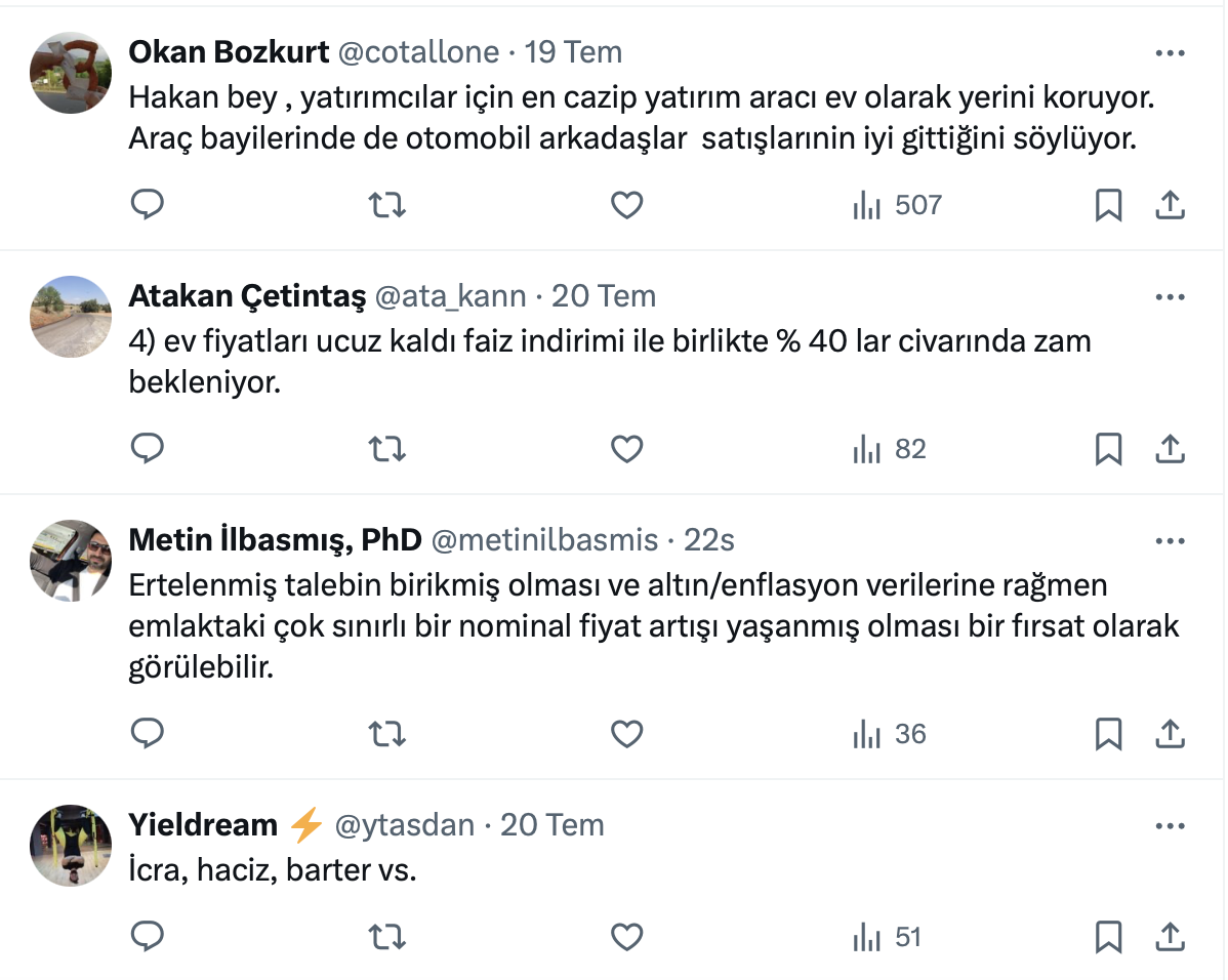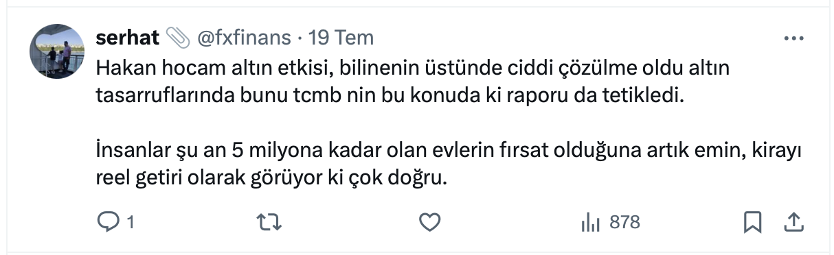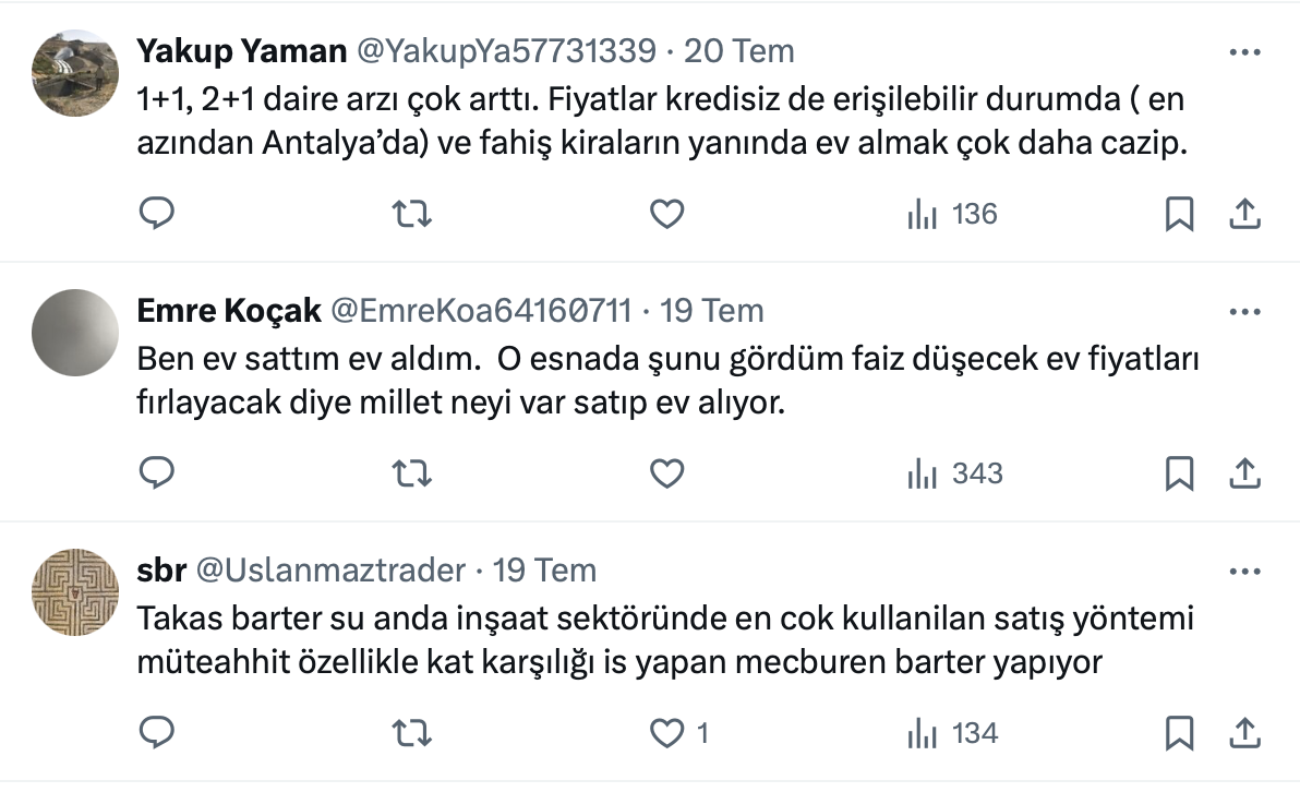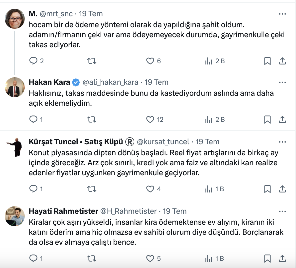 Prof. Dr. Ali Hakan Kara, resmi X hesabı https://twitter.com/ali_hakan_kara üzerinden yaptığı paylaşımda “Yılın ilk yarısında 2022 yılındakine yakın konut satılmış. 2022’de konut kredisi boldu, enflasyon çılgınca fırlamıştı, kredi faizi %18’di. Peki konut kredisinin kısıldığı ve faizin %43 ile tarihi zirvelerde olduğu bu dönemde ne oluyor? Sadece altın fiyatlarıyla bu açıklanamaz.” ifadelerini kullandı.