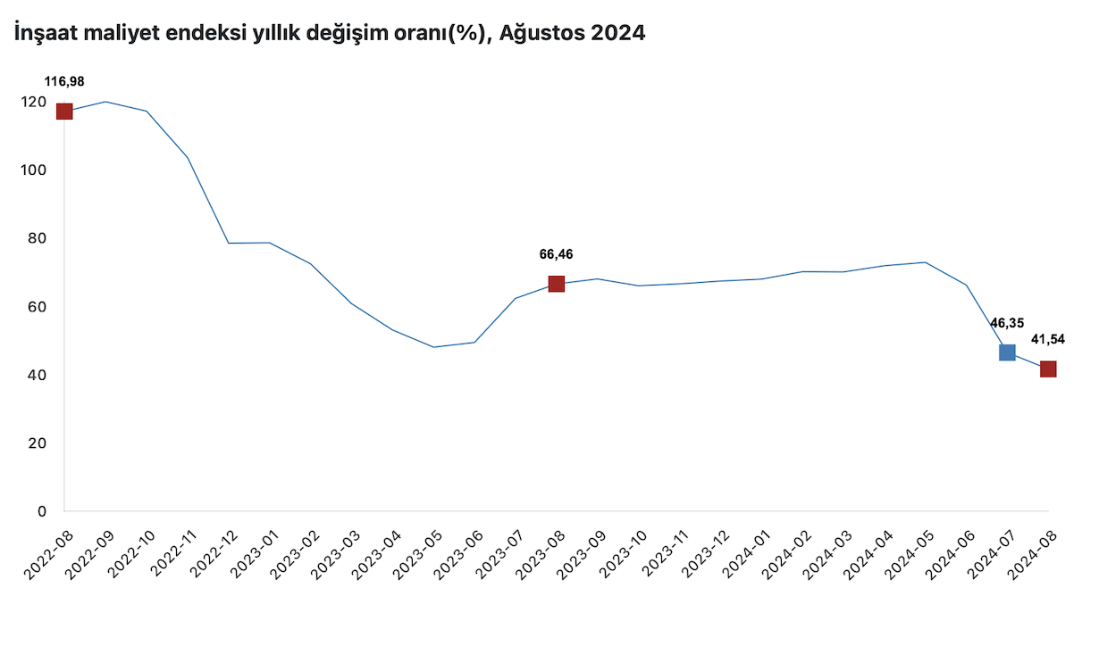 Türkiye İstatistik Kurumu tarafından açıklanan ve sektör tarafından da merakla beklenen resmi rakamlara göre inşaat maliyet endeksi, 2024 yılı Ağustos ayında bir önceki aya göre yüzde 1,18 artarken, bir önceki yılın aynı ayına göre yüzde 41,54 artış gösterdi.