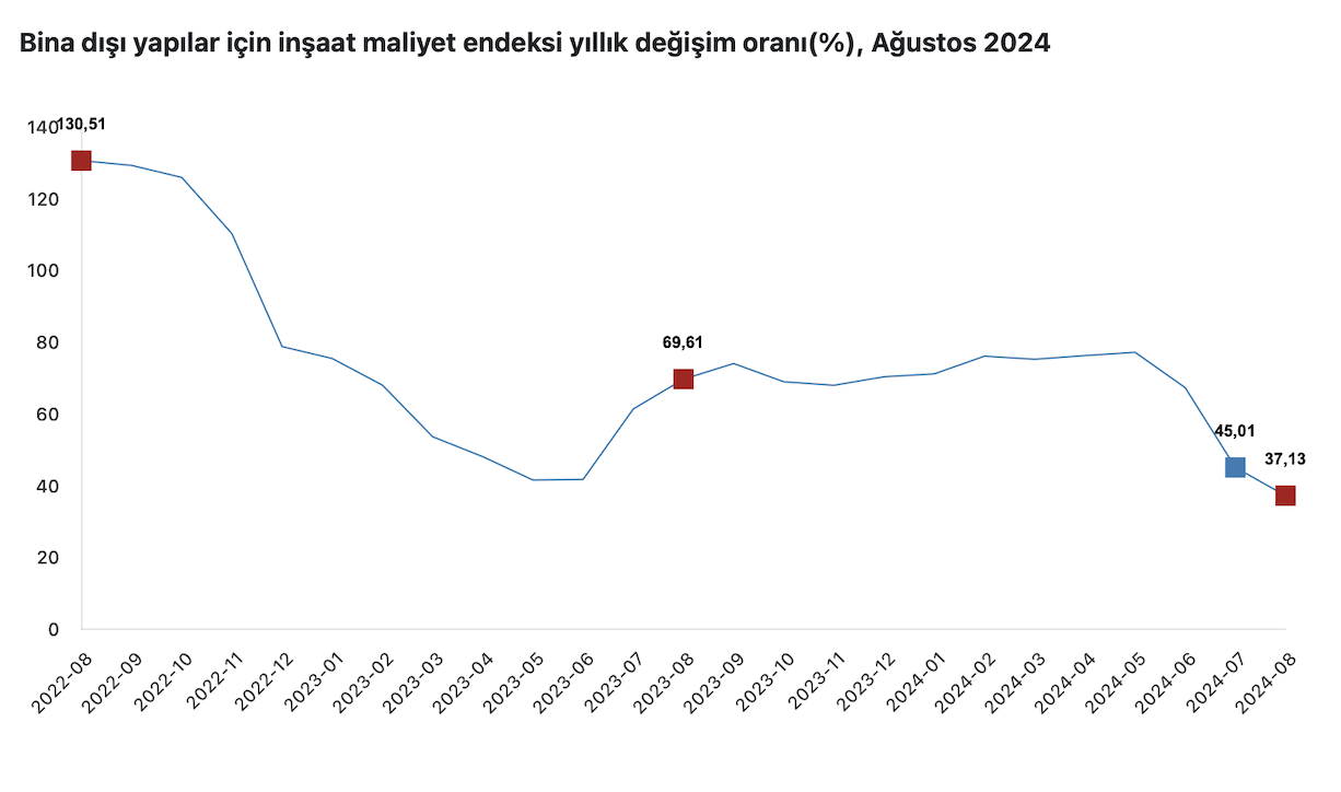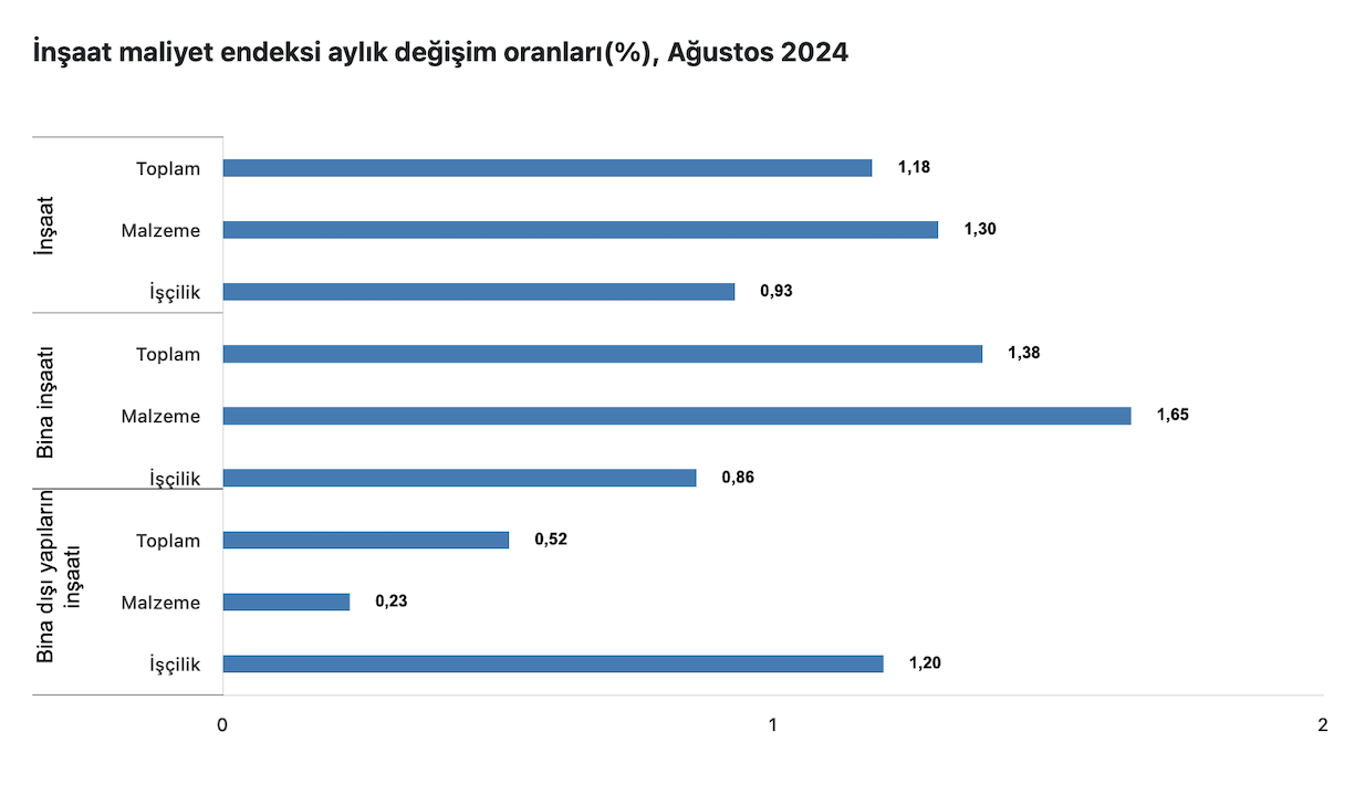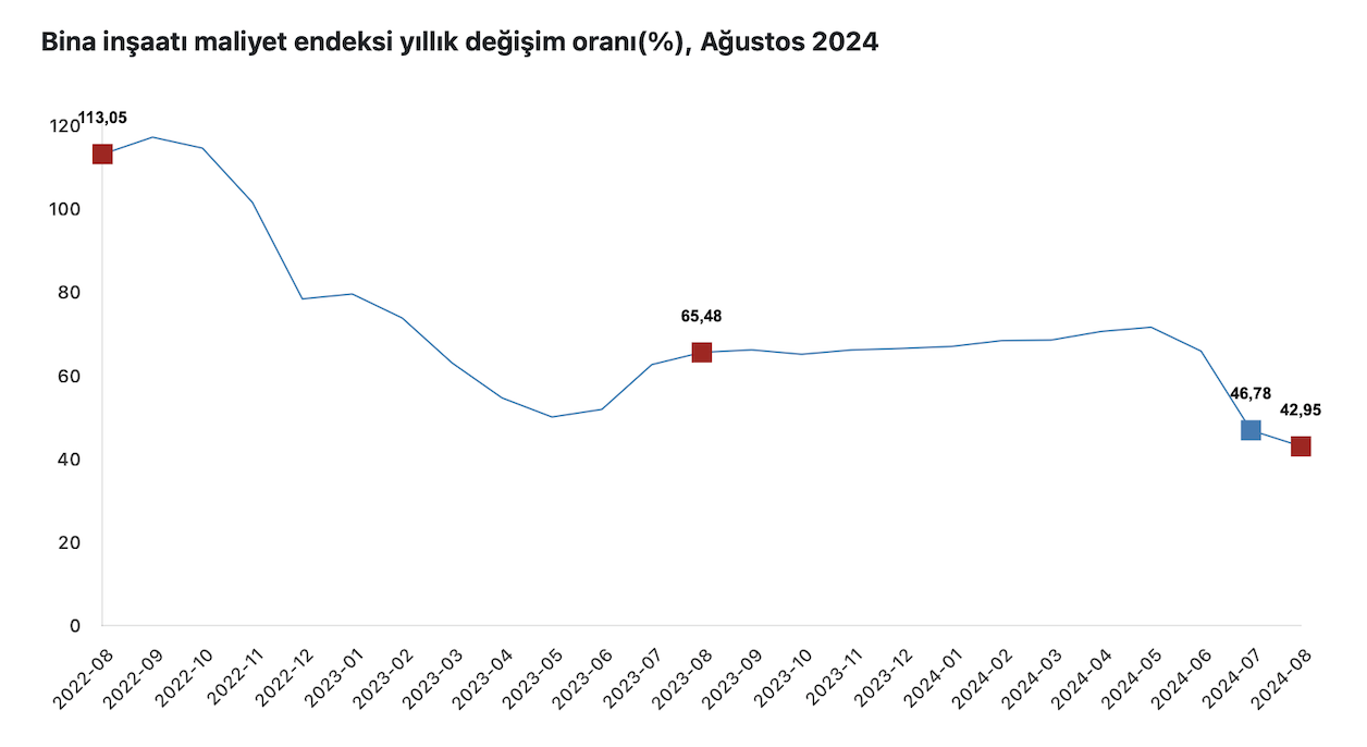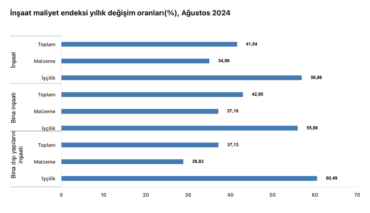 Türkiye İstatistik Kurumu tarafından açıklanan rakamlara göre inşaat maliyet endeksi, 2024 yılının Ağustos ayında bir önceki aya göre yüzde 1,18 artış gösterirken, bir önceki senenin aynı ayına göre yüzde 41,54 artış gösterdi.