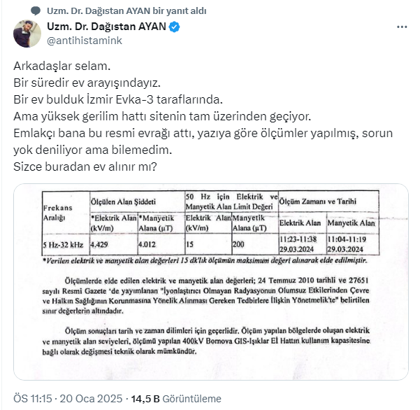 Ünlü doktor Uzm. Dr. Dağıstan Ayan'dan konuyla ilgili bir soru geldi. Dağıstan, uzun zamandır bir ev aradığını ve sonunda bulduğunu fakat evin yüksek gerilim hattı üzerinde olduğunu söyledi.